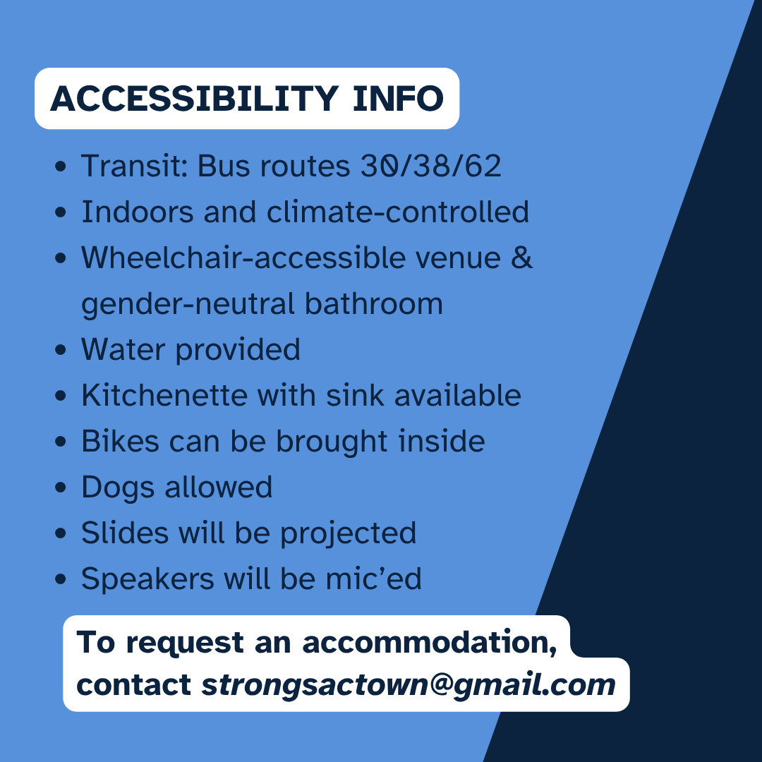 To request an accommodation or for other questions about accessibility, please contact strongsactown@gmail.com.